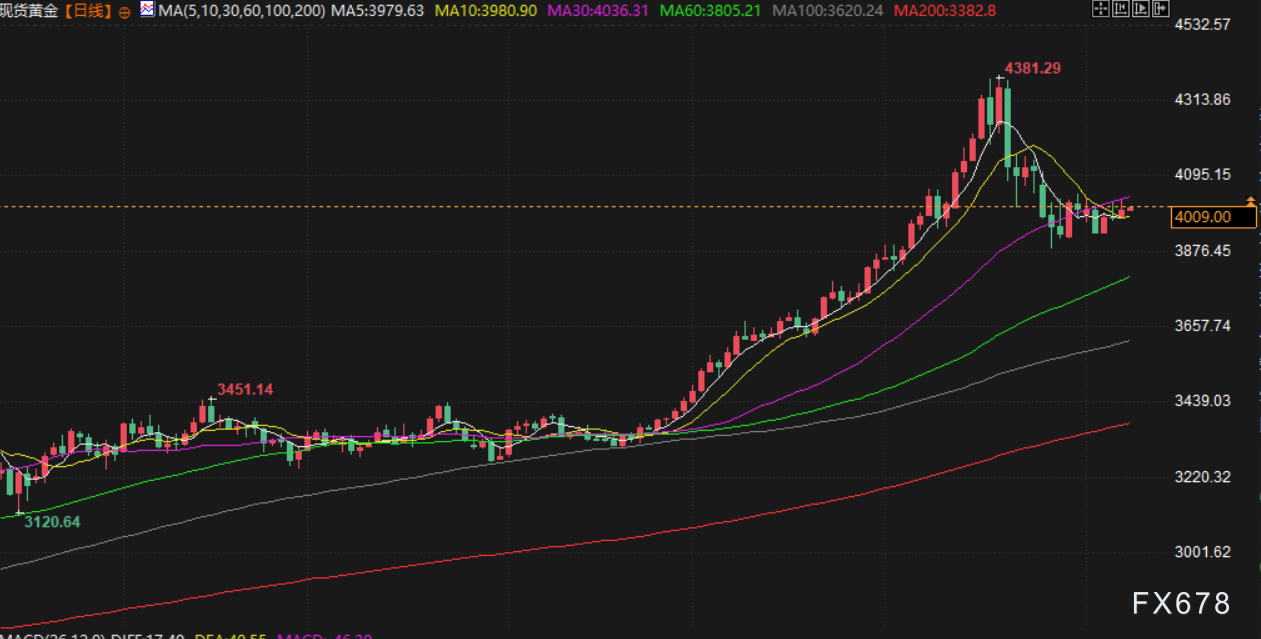 金价上周五上涨,主要受到美元走软以及美国政府关门不确定性带来的避险需求支撑。现货金收报每盎司4005.21美元,涨幅0.7%;美国期金收于4009.80美元,涨幅0.5%。