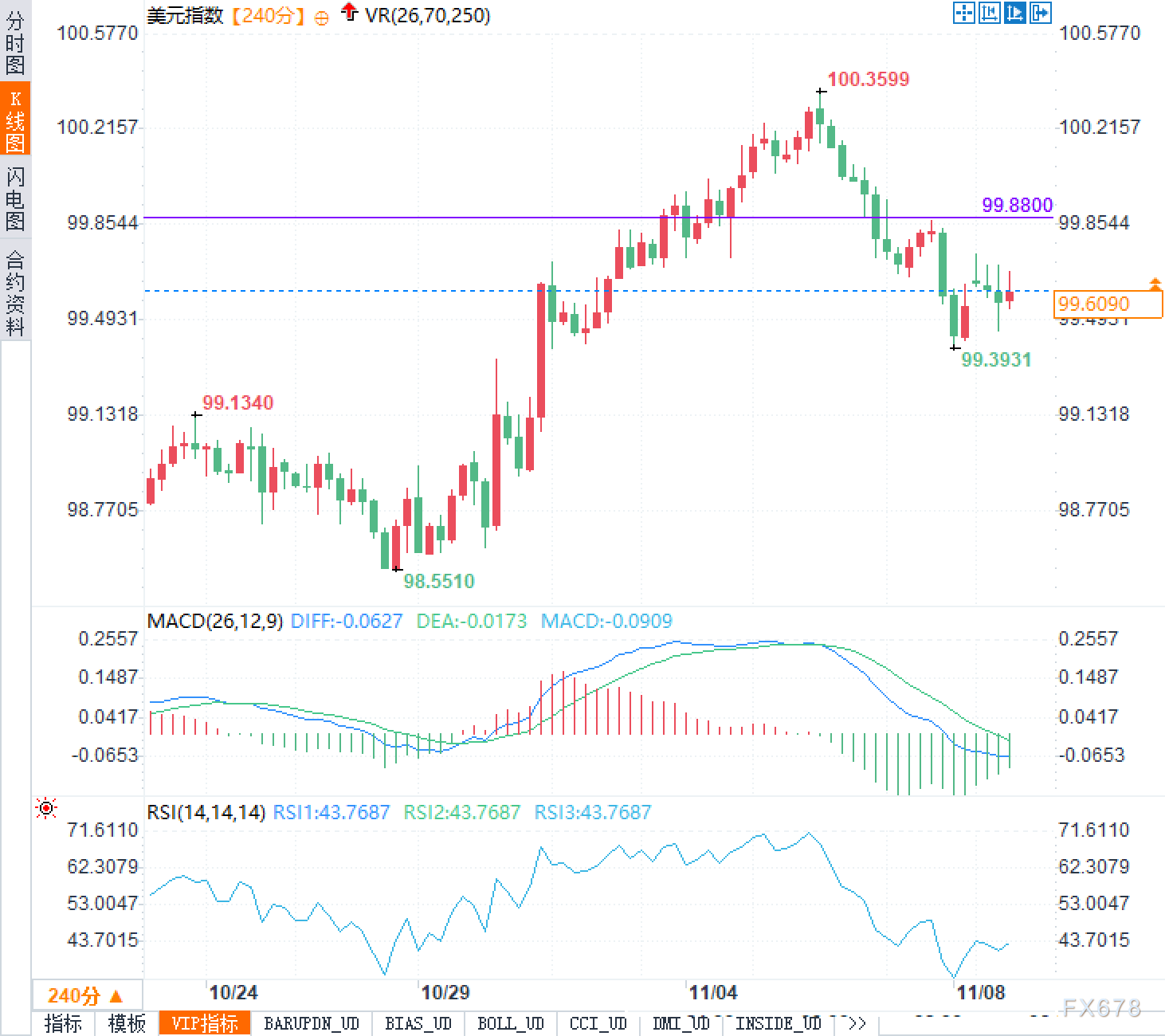 美元指数240分钟图显示,上探100.3599后回落,近日在99.3931形成阶段低点,当前报99.6090。价格仍处下降结构内,99.8800为上方重要压制,100.00—100.36为更强阻力区。MACD位于零轴下,DIFF与DEA未金叉,但绿柱显著收窄,显示下行动能减弱、进入技术性修复。