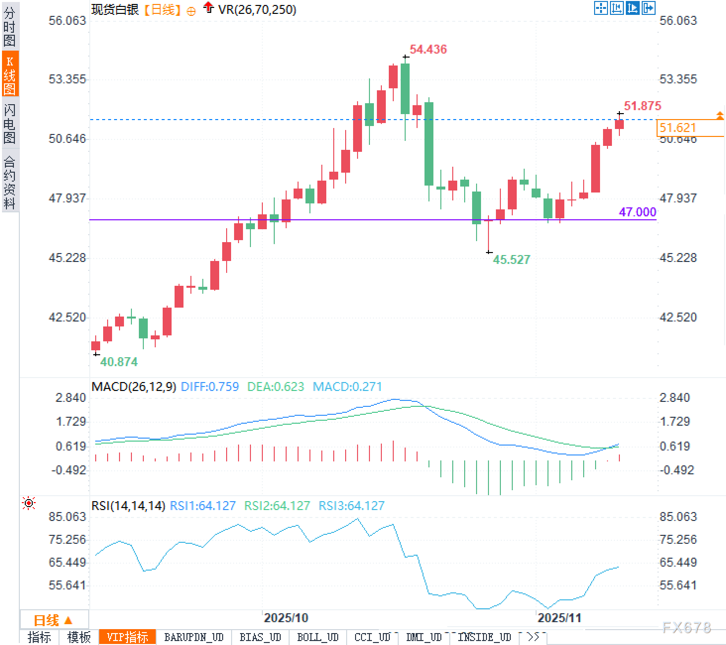 日线看,白银自45.53一线展开台阶式反弹并重回50.65上方。前高54.44构成阶段压力,图中51.88附近亦为近端阻力,47.00为显著支撑。连阳后K线实体收敛,上攻动能边际放缓。