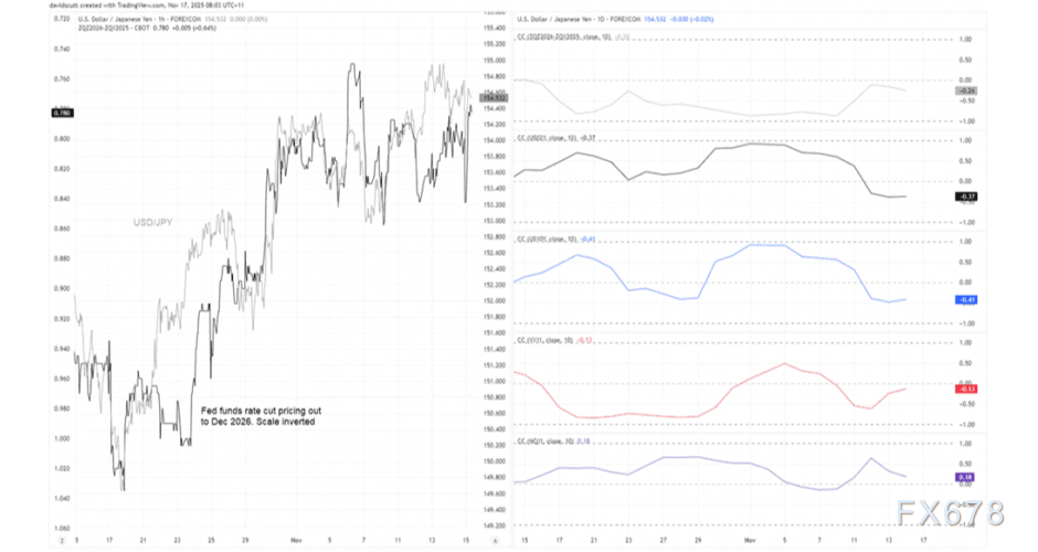 汇通财经APP讯——周一(11月17日)美元兑日元一度上涨约0.18%至154.78附近。美元兑日元已脱离传统的利率与风险驱动因素,但随着本周美国官方数据恢复发布,其与美债收益率的关联性可能重新建立。非农就业与薪资数据将成为市场焦点,特别是在美联储是否于12月再次降息这一问题上市场存在分歧的背景下。英伟达财报表现可能影响套息交易资金流向,而即将举行的国债拍卖活动则增添事件风险。