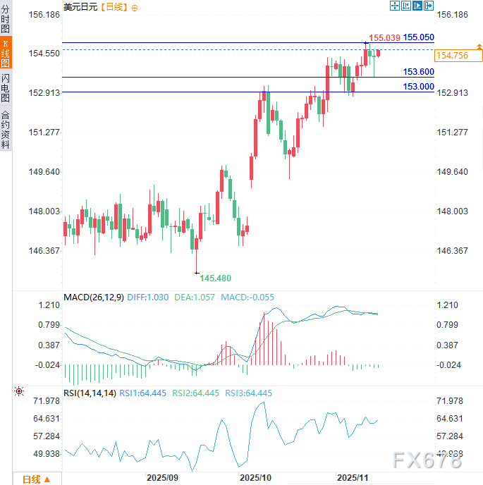 上行方面,155.00-155.05是首个关键阻力区域,该水平与11月12日高点(155.04)重合。若有效突破,下一目标将指向156.50阻力区域。
