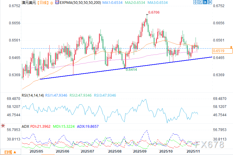 澳大利亚统计局(ABS)最新数据显示,10月该国劳动参与率稳定在67%;新增就业岗位4.22万个,远高于市场预期的2万个,且显著高于前一月的1.27万个;失业率从4.5%降至4.3%。就业数据公布后,澳元/美元汇率维持横盘整理。