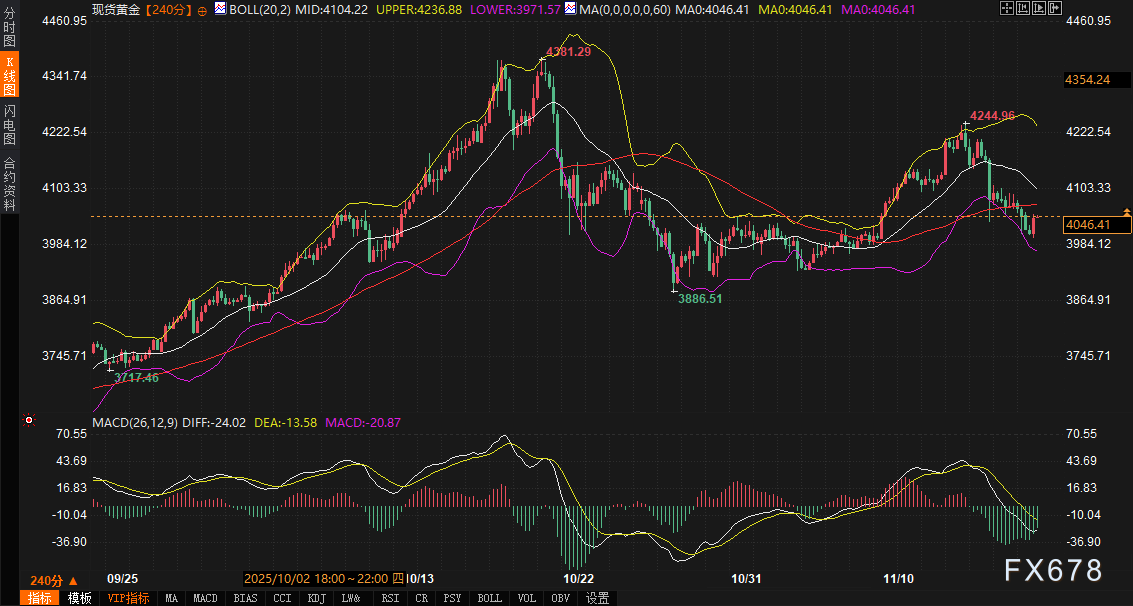 现货黄金240分钟图最新报价4047.67美元,运行于布林带中轨4014.28至上轨4236.84的宽幅通道内。MACD虽维持死叉,但绿柱收短,快慢线差距缩小,显示下方动能衰竭。