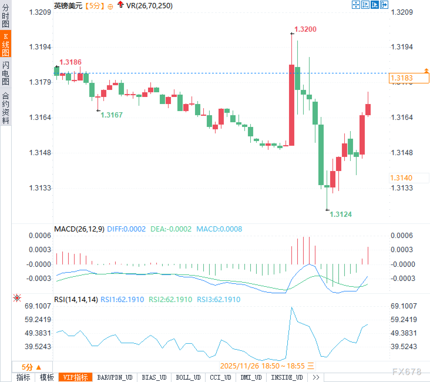 预算数据意外提前泄露后,市场经历了戏剧性的多空博弈。英镑兑美元汇价最初快速拉升触及1.3200整数关口,但随后迅速反转,一度跌至1.3150下方。从5分钟K线图观察,汇价在1.3200处遭遇强劲抛压,形成明显的上影线,随后连续收出数根阴线。