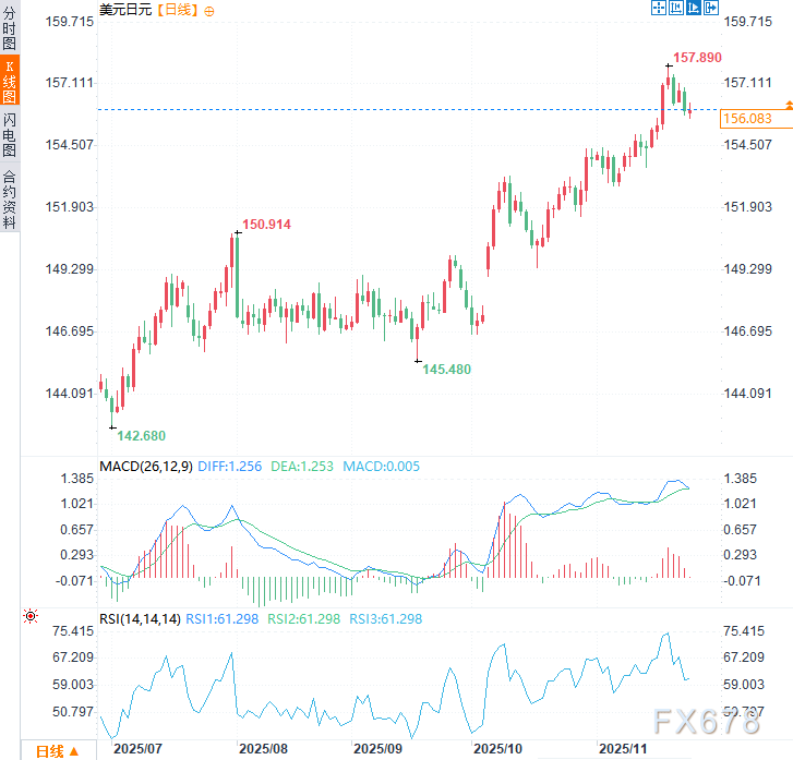 汇通财经APP讯——日本央行正为最早下个月的加息可能性向市场释放信号,消息人士称,随着对日元急剧贬值的担忧重燃以及要求维持低利率的政治压力消退,央行已重新采用先前的鹰派表述。周三(11月26日)亚洲时段,美元兑日元于156.08附近高位窄幅震荡,略低于上周创下的近十个月高点(157.89)。