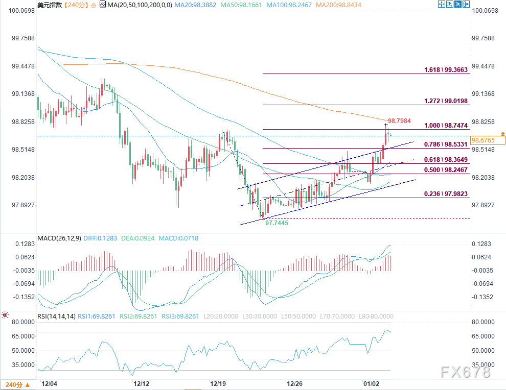 上方来看,99.00关口的200期指数平均线(200-SMA)是重要阻力位;下方支撑则位于98.12和97.90。当前相对强弱指标(RSI)读数为69,释放出积极的动能信号。