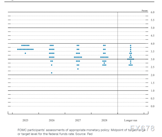 点阵图则透露了更丰富的信息,尽管委员们对2026年降息次数的中位预期仅为一次,但预期分布的跨度极大。